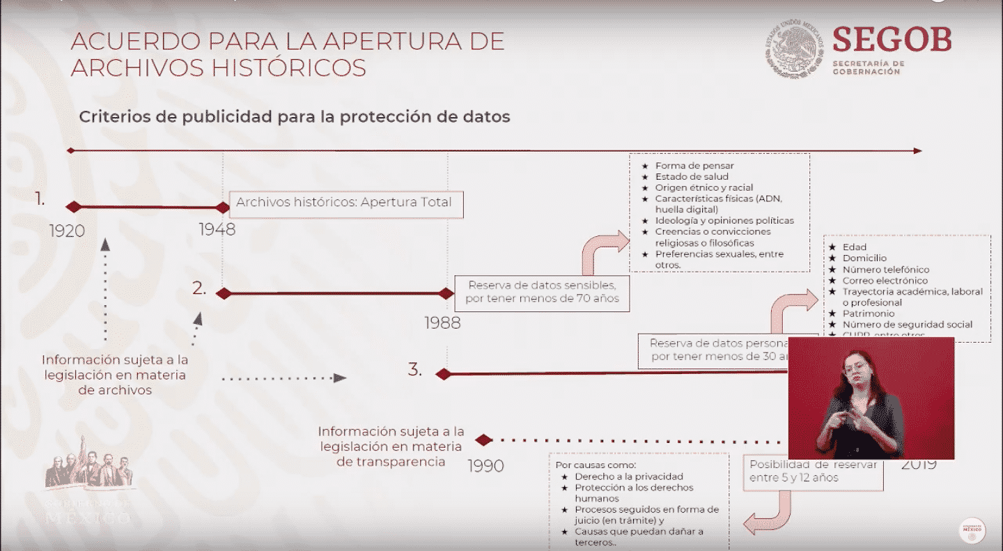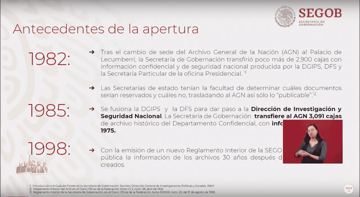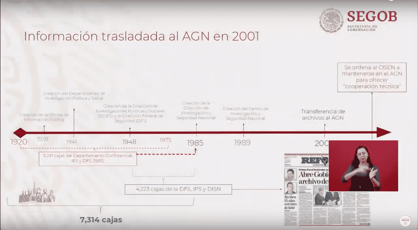 • Efectivamente la información que se les está solicitando a las dependencias es toda aquella que generó fichas y documentos que tienen que ver con esto, los archivos históricos tienen una apertura total, el problema es que a veces se reservaba información porque supuestamente estaba en investigación y ahora tendrán 28 días para hacer lineamientos y a partir de eso se comenzarán a abrir los archivos.