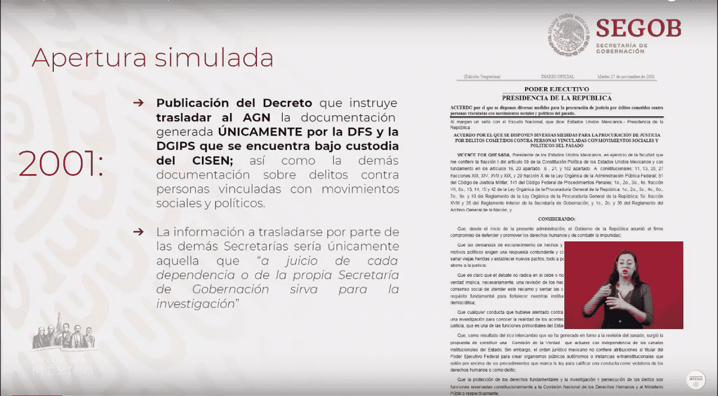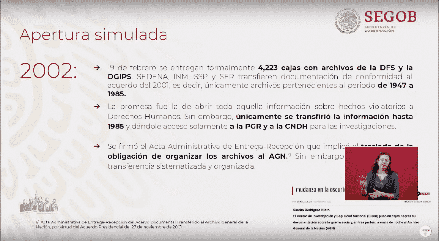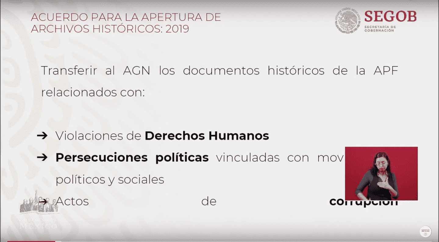 • Acerca de que si se sustrajeron expedientes, nosotros estamos haciendo un diagnóstico y creemos que la documentación está intacta y no se han llevado nada hasta ahorita en el recuento que estamos haciendo, por eso la resguardaban, no tenía caso que ellos sacaran información que ellos mismos resguardaban, el presidente firmó el acuerdo y es para todas las instituciones y va incluida Marina, Sedena, todas las instituciones y todos aquellos documentos que tengan que ver con problemas políticos y sociales son el centro de éste acuerdo.