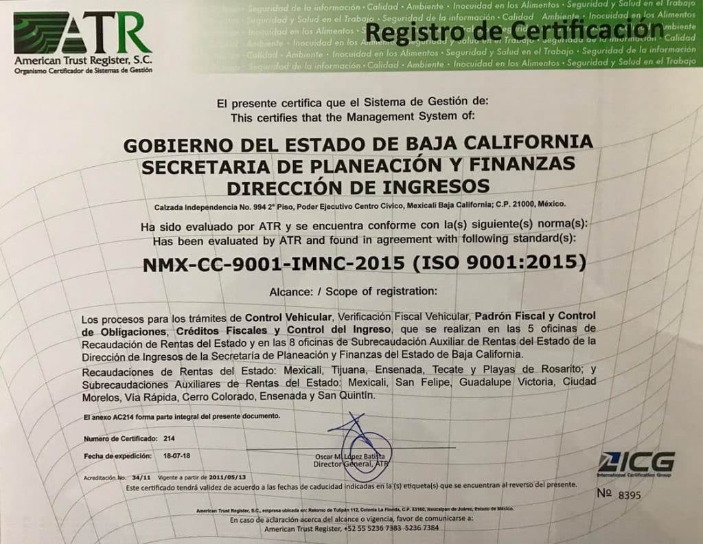 MEXICALI, B. C.- Jueves 20 de junio de 2019.- El Gobierno del Estado que encabeza el Mandatario Francisco Vega de Lamadrid, a través de la Secretaría de Planeación y Finanzas (SPF) recibe la recertificación anual de la Norma NMX-CC-9001-IMNC-2015/ISO 9001:2015 Sistemas de Gestión de Calidad en la atención al ciudadano en el área de trámites vehiculares.
