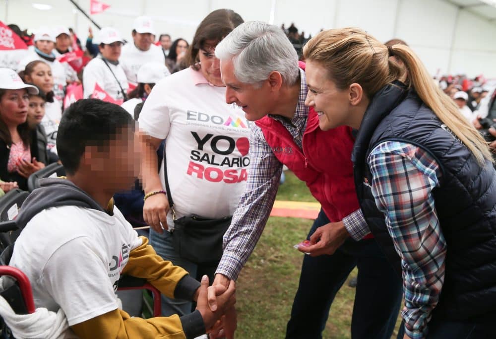 Calimaya, Estado de México, 3 de julio de 2019. Como parte de las acciones que lleva a cabo la administración estatal para apoyar a quienes tienen alguna discapacidad, el Gobernador Alfredo Del Mazo Maza, junto con su esposa y Presidenta Honoraria del DIFEM, Fernanda Castillo de Del Mazo, entregaron tarjetas del Programa Salario rosa para amas de casa que tienen algún hijo que padece esta condición.