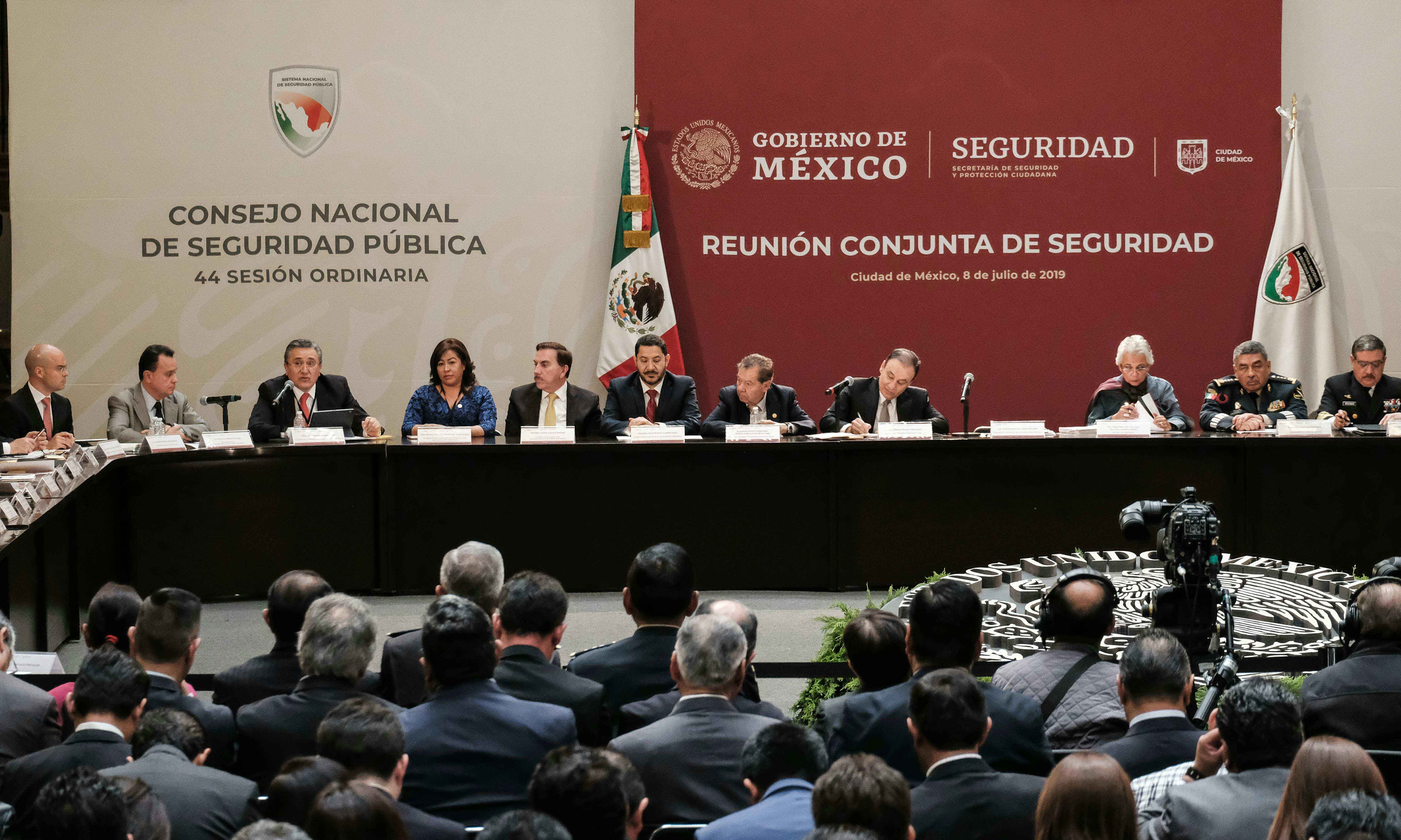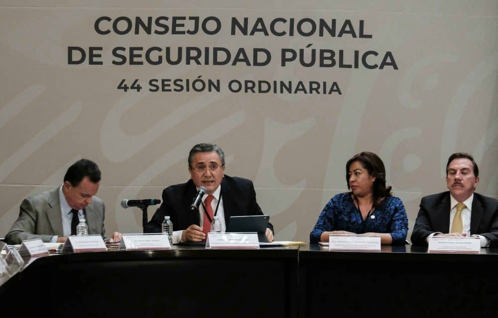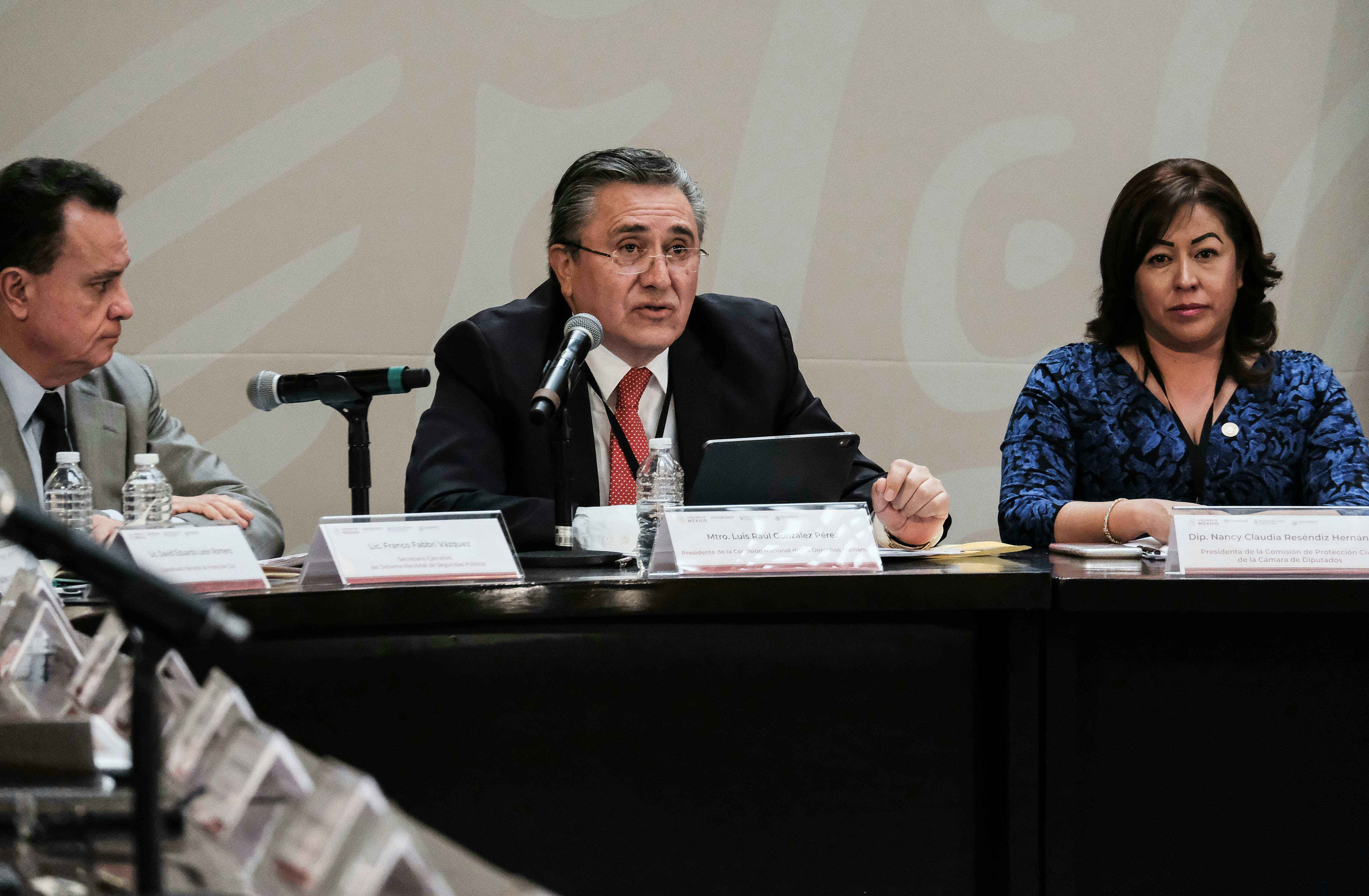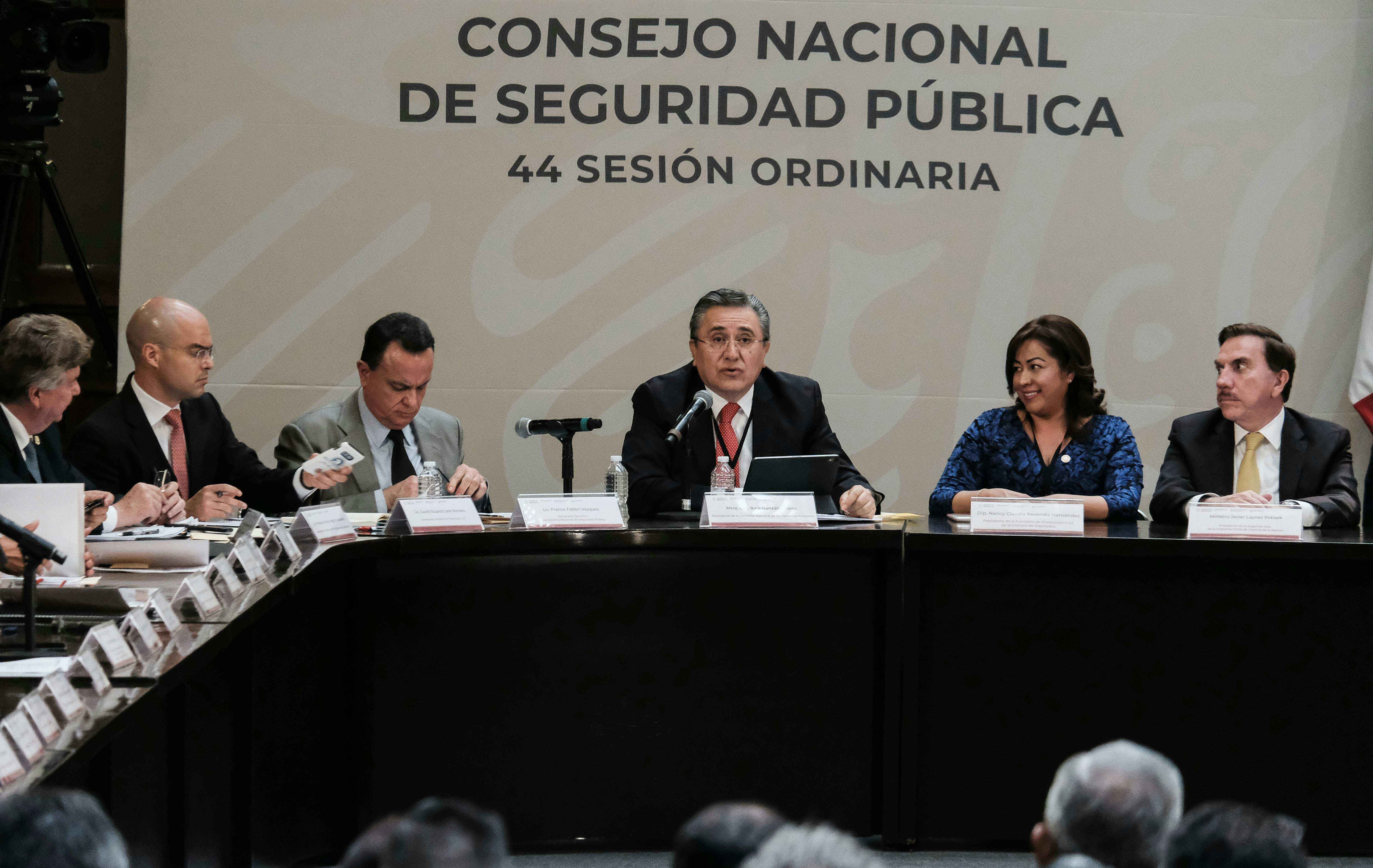 González Pérez habló en la sesión que fue encabezada por el Presidente Andrés Manuel López Obrador, y en la que estuvieron la Secretaria de Gobernación, Olga SánchezCordero; el Secretario de Seguridad y Protección Ciudadana, Alfonso Durazo Montaño; Almirante Eduardo Redondo Arámburo, Subsecretario de Marina; Dagoberto Espinosa Rodríguez, Subsecretario de la Defensa Nacional; Ministro Javier Lainez Potizek, en representación del Presidente de la Suprema Corte de Justicia de la Nación; Diputado Porfirio Muñoz Ledo, Presidente de la Mesa Directiva de la Cámara de Diputados; Senador Martí Batres Guadarrama, Presidente de la Mesa Directiva del Senado de la República; Secretario Ejecutivo del Sistema Nacional de Seguridad Pública, Franco Fabbri Vázquez; Secretaria de la Función Pública; Irma Eréndira Sandoval Ballesteros; Auditor Superior de la Federación, David Rogelio Colmenares Páramo; Coordinador Nacional de Protección Civil, David León Romero, y el Director Ejecutivo del Sistema de Información para la Seguridad Humana, S.C., Mario Arroyo Juárez; así como la y los gobernadores de 24 entidades federativas y la Jefa de Gobierno de la Ciudad de México, Claudia Sheinbaum.