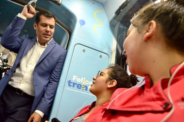 “El año pasado con un fondo de FOTRADIS y con el apoyo muy reconocido del DIF estatal pudimos obtener un fondo que nos permitió adquirir 7 ascensores, 8 salvaescaleras, guías podotáctiles, tótems, rampas como las que ven a mis espaldas y bueno trabajamos duro par ir mejorando la accesibilidad en el sistema. Estamos orgullosos del tren que todos queremos y estamos comprometidos para que mejore el servicio en todos los ámbitos, en confort, equipamientos que estén 100% y también estamos pensando a futuro”.