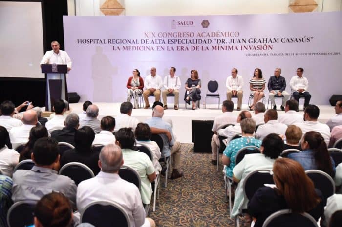 Al participar en el evento inaugural del XIX Congreso Académico del Hospital Regional de Alta Especialidad “Doctor Juan Graham Casasús”, “La medicina en la era de la mínima invasión”, el mandatario reiteró el compromiso de dotar cada día de mejores herramientas y equipos modernos a los hospitales del Estado, para elevar la calidad de servicio a favor de los tabasqueños.