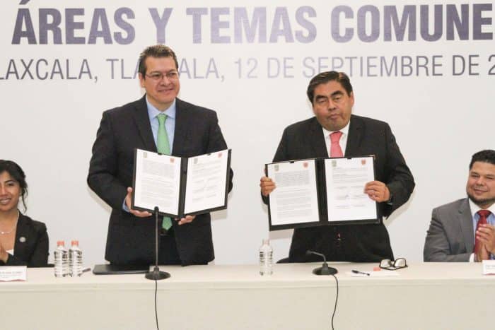 El Gobernador Marco Mena y su homólogo de Puebla, Miguel Barbosa Huerta, firmaron este jueves el Convenio Marco de Coordinación y Colaboración para el Desarrollo de las Áreas y Temas Comunes entre Tlaxcala y Puebla, con lo que iniciaron de manera operativa las acciones conjuntas a través de la instalación de tres mesas de trabajo que abordan temas fundamentales para el desarrollo de ambas entidades.
