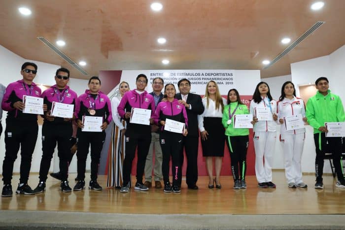 Los deportistas que recibieron estímulos son: Victoria Cruz Romano en la categoría de karate; Diana Luna Sánchez, natación; Marcos Madrid, tenis de mesa; Claudia Romero e Iván Torres, taekwondo; Laura Coraza Castañeda paraatletismo; Moisés Cereso, Omar Otero y Eduardo Cereso, fútbol 5 ASIDE; entre otros que resultaron ganadores en los Juegos Panamericanos y Panamericanos de Lima 2019.