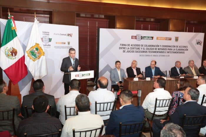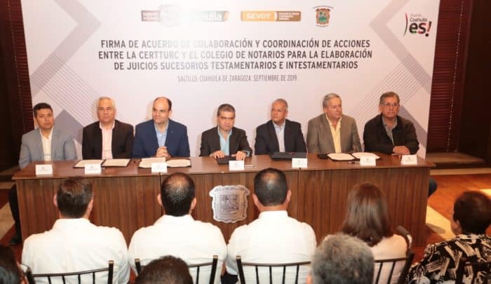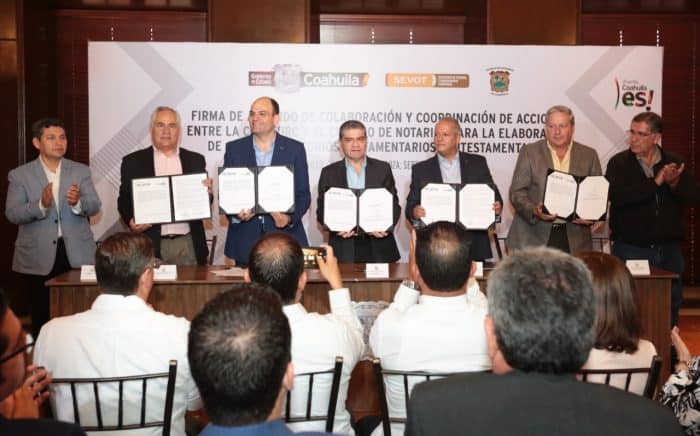 Saltillo, Coahuila de Zaragoza; a 30 de Septiembre de 2019.- Con la prioridad de otorgar seguridad y certeza jurídica sobre el patrimonio de las familias de escasos recursos económicos y que se encuentran dentro de los polígonos de pobreza que así lo requieran, el Gobierno del Estado celebró la firma de convenio con el Colegio de Notarios, con el que se otorgan grandes descuentos en las tarifas de los juicios sucesorios que se requieran para escriturar.