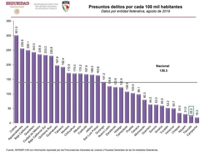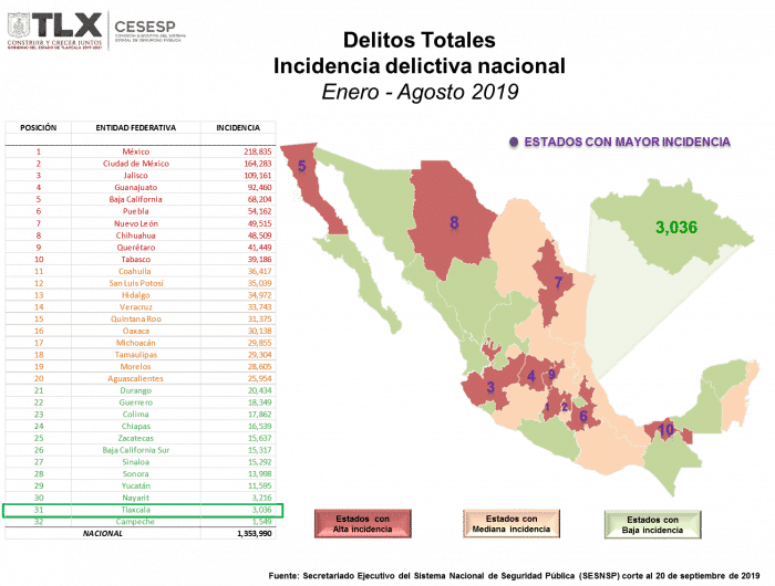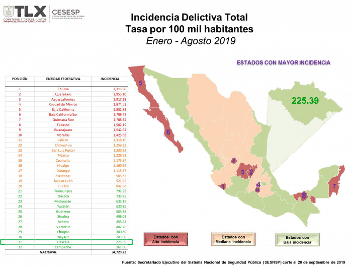 La Secretaría de Seguridad Ciudadana (SSC) dio a conocer el balance general de los trabajos y acciones implementadas durante el periodo septiembre 2018-2019, que se reflejan en los datos estadísticos que presentó el Secretariado Ejecutivo del Sistema Nacional de Seguridad Pública (Sesnsp), los cuales consolidan a Tlaxcala como el segundo estado más seguro del país.