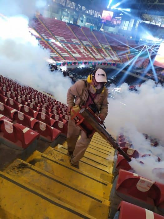 Como parte de las acciones de control del mosquito transmisor del dengue, la SSJ realizó hoy trabajo de fumigación en el Auditorio Benito Juárez, previo a las Fiestas de Octubre y en la Expo Ganadera.