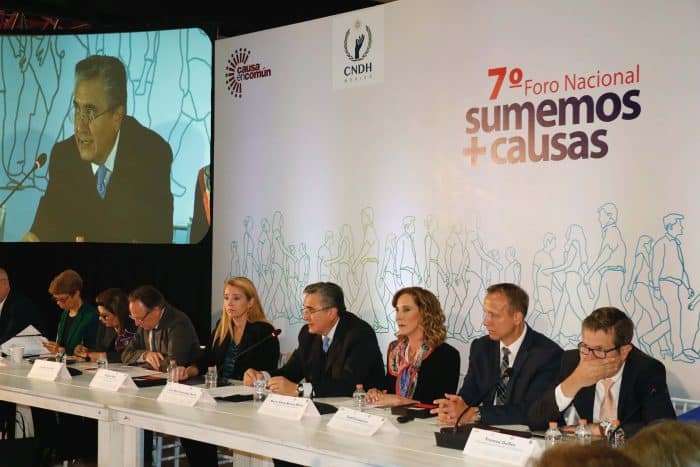 Al participar en la inauguración del Foro Nacional “Sumemos Causas por la Seguridad: Ciudadanos + Policías”, organizado por Causa en Común, destacó que la atención a los problemas de seguridad y justicia debe emprenderse bajo un enfoque integral que, partiendo de diagnósticos adecuados y bajo una lógica preventiva, más que reactiva, se ocupe de los factores que generan o propician las actividades delictivas, así como del desarrollo de capacidades y recursos para la efectiva persecución y combate de las actividades ilícitas, con pleno respeto a los derechos humanos. El combate al crimen organizado no debe atender a razones ideológicas o políticas, sino a la necesidad que requiere la participación y articulación efectiva de las distintas instancias y órdenes de gobierno, sumando esfuerzos, capacidades y recursos.