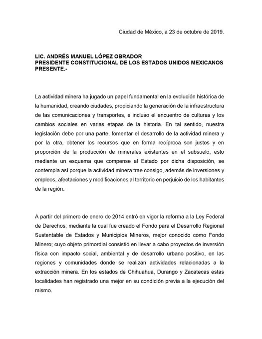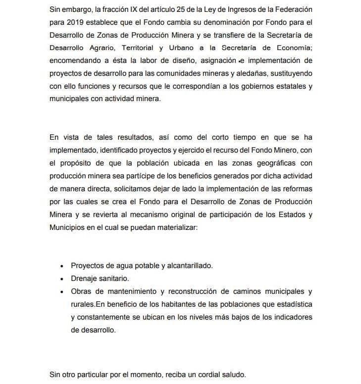 La carta refiere que a partir del primero de enero de 2014 entró en vigor la reforma a la Ley Federal de Derechos, mediante la cual fue creado el Fondo para el Desarrollo Regional Sustentable de Estados y Municipios Mineros, mejor conocido como Fondo Minero.