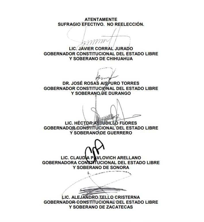Además del mandatario chihuahuense, la misiva fue firmada por sus homólogos de Durango, José Rosas Aispuro; de Guerrero, Héctor Astudillo Flores y de Zacatecas, Alejandro Tello Cristerna, así como por la gobernadora de Sonora, Claudia Pavlovich Arellano.