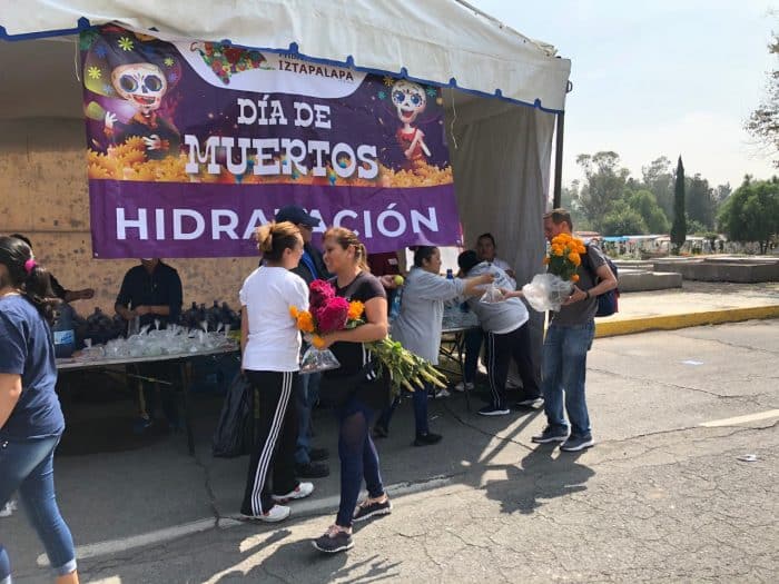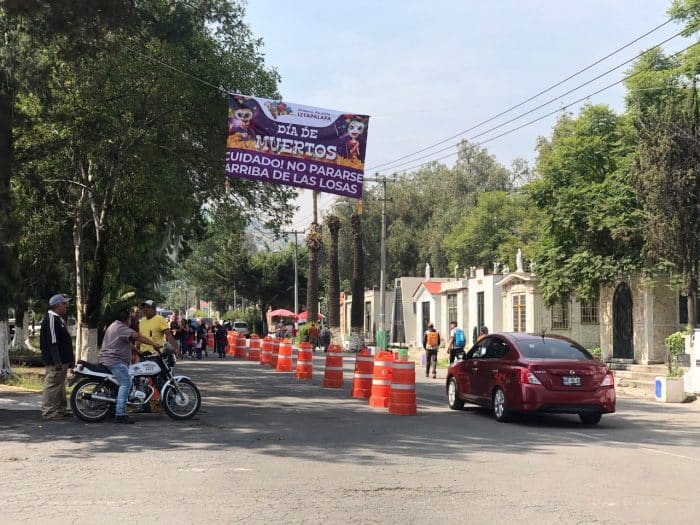 Los trabajadores de la Alcaldía y los elementos de la Policía Auxiliar realizan recorridos por los panteones para inhibir infracciones administrativas, delitos y evitar que los vehículos sean estacionados en lugares donde obstaculicen la circulación. También se instalaron puestos de hidratación.