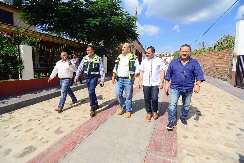 El Gobernador inauguró las obras municipales en la calle David Hinojosa, en el centro de Guachinango y aceptó la invitación para comer con los ciudadanos antes de continuar las actividades en la región.