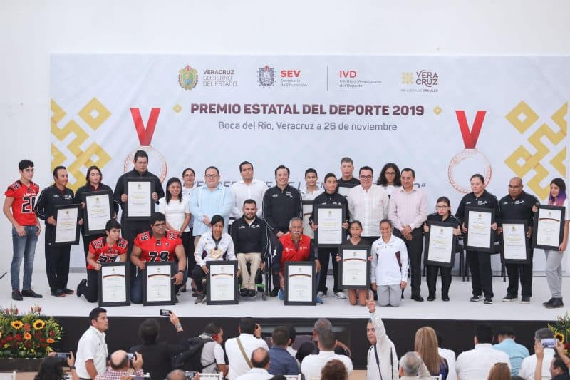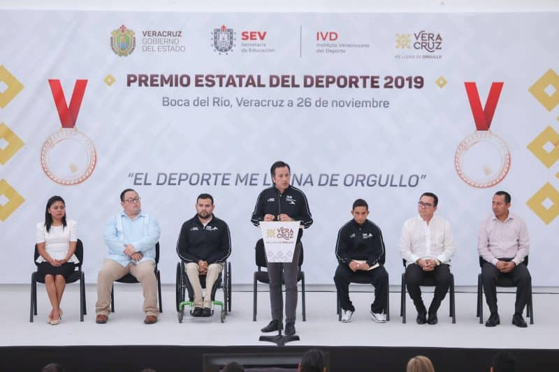 Boca del Río, Ver., 26 de noviembre de 2019.- Al entregar el Premio Estatal del Deporte, el gobernador Cuitláhuac García Jiménez destacó que los atletas merecen instalaciones según su nivel, por lo que buscará el financiamiento para intervenir los espacios que están en abandono.