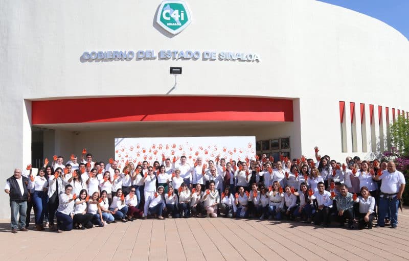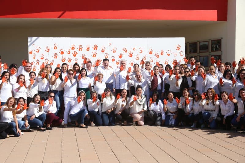 En la explanada del Complejo Estatal de Seguridad, los colaboradores de todas las áreas que conforman esta dependencia se reunieron para plasmar las huellas de sus manos en color naranja sobre un lienzo blanco como señal de rechazo a la violencia contra mujeres y niñas.