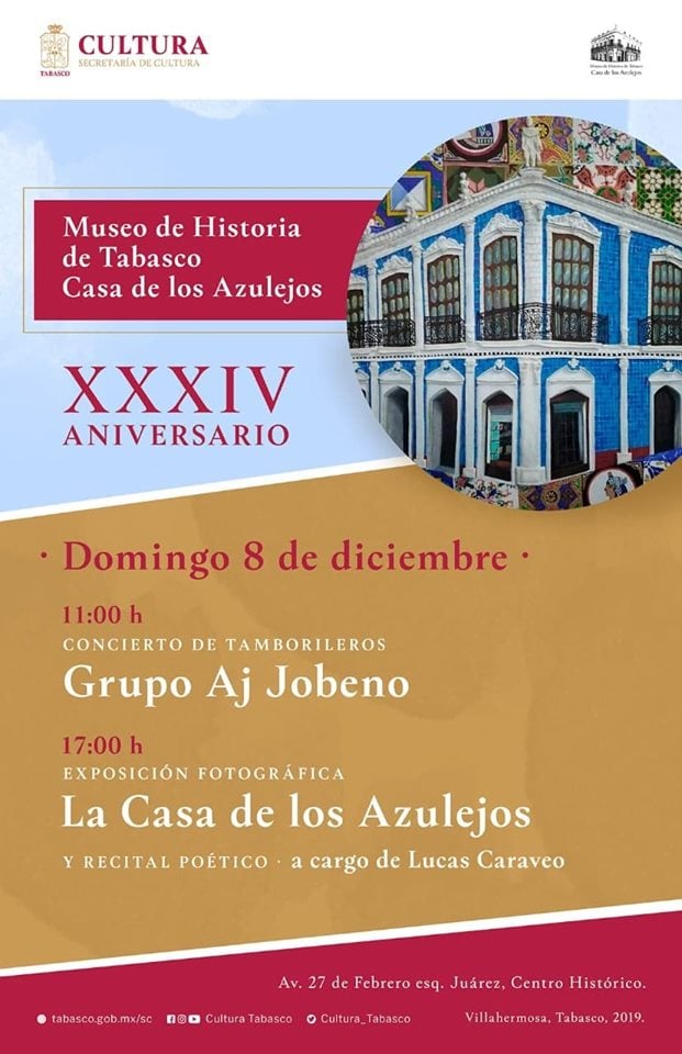 En el marco del 34 aniversario del Museo de Historia de Tabasco “Casa de los Azulejos”, ubicado en el Centro Histórico de Villahermosa, se tiene programada una serie de actividades el domingo 08 de diciembre. La entrada es gratuita.