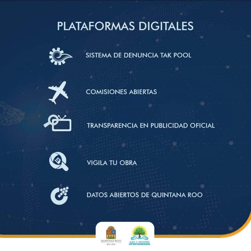 Las plataformas digitales también abonan para fortalecer la transparencia en Quintana Roo, por eso se ha creado el Portal de Comisiones Abiertas, Transparencia en Publicidad Oficial, Vigila tu Obra, el portal y aplicación móvil TAK POOL y la plataforma de Datos Abiertos Quintana Roo.