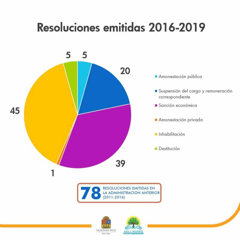 En el tema de combate a la corrupción, destaca que de 2016 a 2019 se han emitido 115 resoluciones que van desde amonestación pública, suspensión del cargo y remuneración correspondiente, sanción económica, amonestación privada, inhabilitación y destitución del cargo.