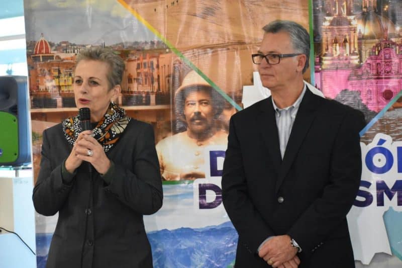 La directora estatal de Turismo, Nathalie Desplas Puel y el gerente comercial de American Airlines para México, Gunther Leudesdorf, inauguraron la nueva ruta aérea Phoenix-Chihuahua, cuyo primer vuelo llegó esta tarde al Aeropuerto Internacional General Roberto Fierro.