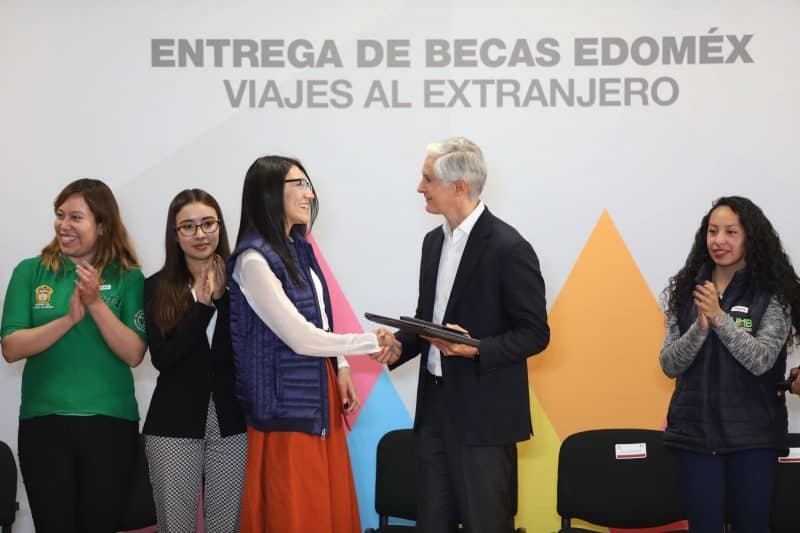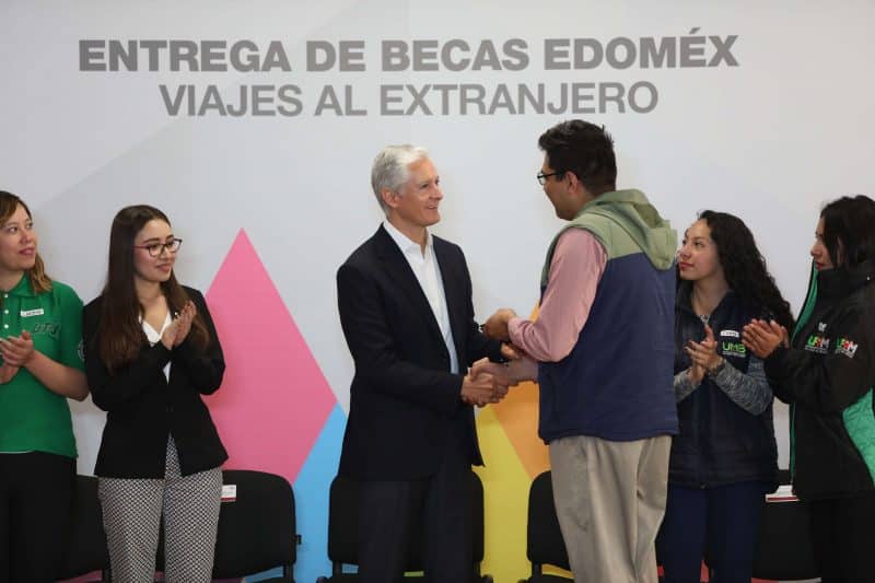 Junto con los Secretarios de Educación, Cultura y Obra Pública, el Gobernador Alfredo Del Mazo entregó becas del programa Viajes al Extranjero, a 25 alumnos de Ingeniería destacados por su aprovechamiento académico, quienes tendrán la oportunidad de estudiar en la Universidad Politécnica de Madrid, con un apoyo que cubre el costo del programa, hospedaje, alimentación, boleto de avión y gastos personales.