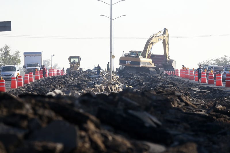 La Secretaría de Infraestructura y Obra Pública (SIOP) mantiene coordinación con autoridades de Transporte y Policía Vial, además se instaló señalización y se aseguraron los carriles de alta velocidad en sentido Oriente-Poniente para iniciar la demolición de barreras centrales y carpeta asfáltica, en pocos días, se empezará a sustituir la carpeta actual por concreto hidráulico alrededor de 500 metros.
