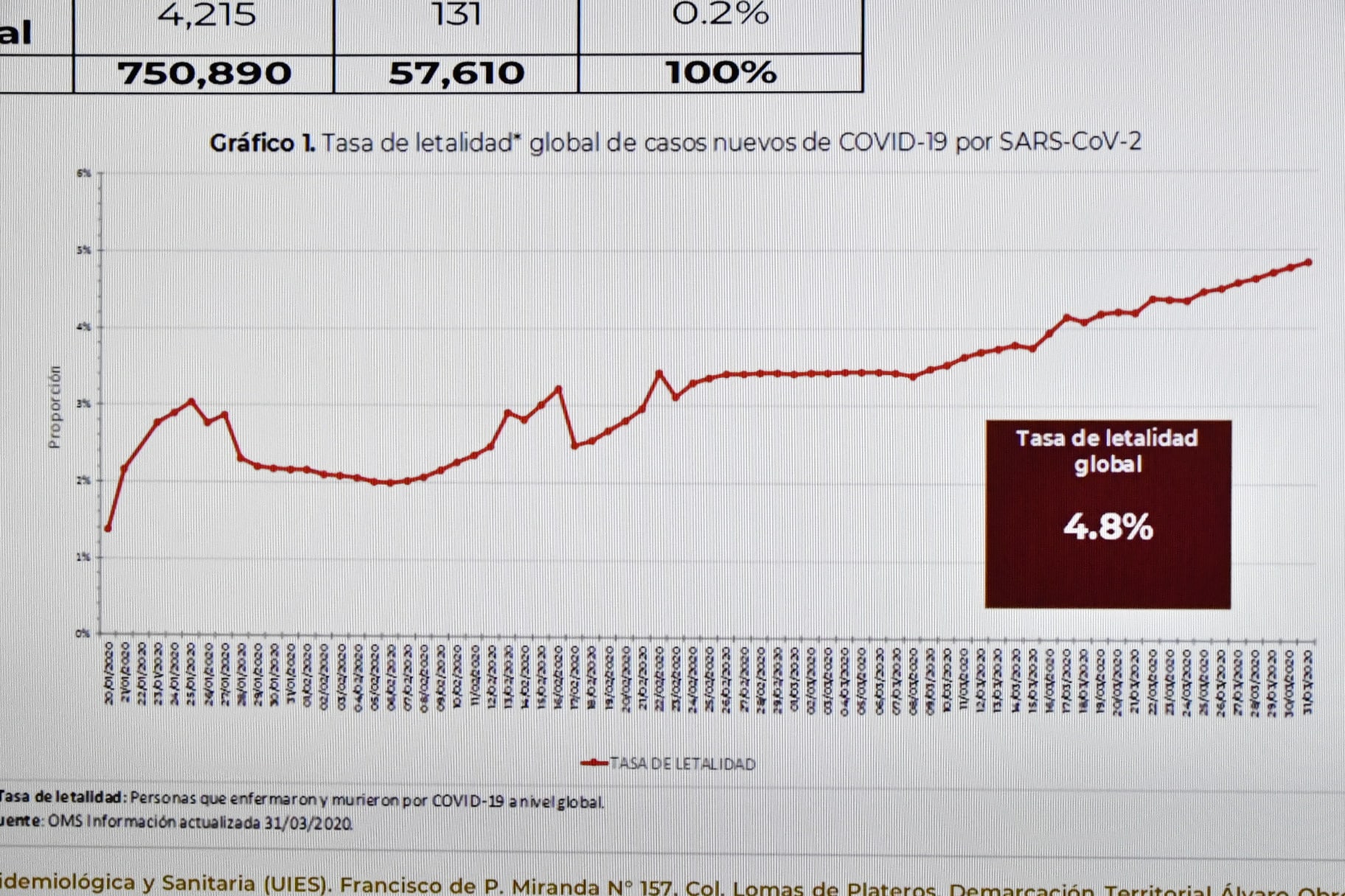Dijo que a nivel mundial existen 750 mil 890 casos y la tasa de mortalidad es de 4.8 por ciento. Europa aglutina el 54 por ciento de los casos.