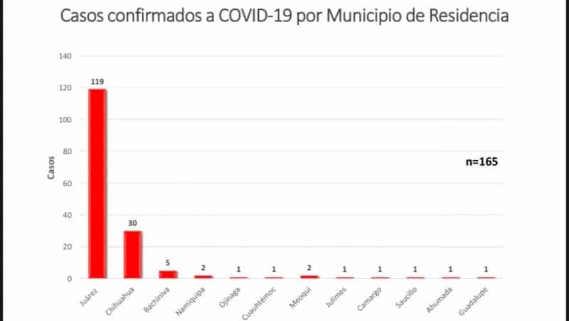 Además de los casos confirmados, 119 pertenecen a Ciudad Juárez, 30 a la ciudad de Chihuahua, con 5 Bachíniva, Meoqui y Namiquipa con 2 cada uno y Cuauhtémoc, Ojinaga, Julimes, Camargo, Saucillo y el Valle de Guadalupe con un caso cada uno.