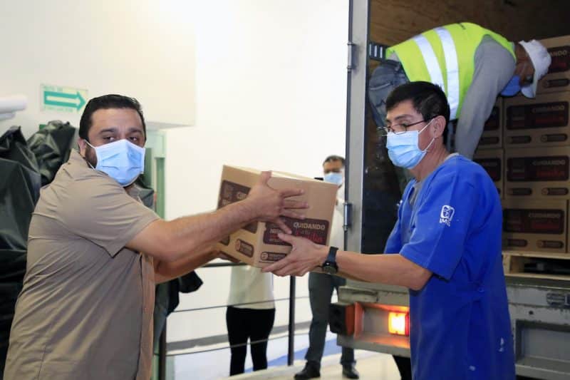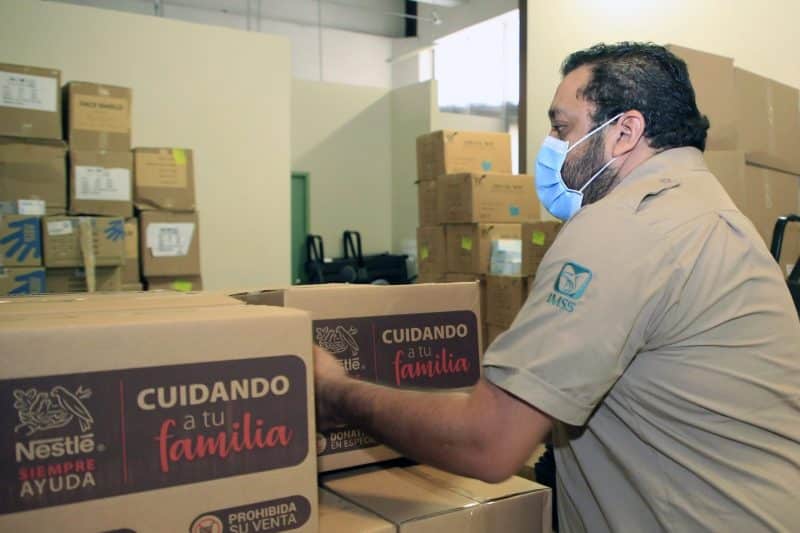 La Fundación IMSS recibió este miércoles 201 despensas de un total de 10 mil que la empresa Nestlé México donó para apoyar a los trabajadores de la salud que laboran en las Unidades Médicas Rurales, en las Unidades Médicas Móviles que funcionan como filtros de detección de Covid-19 y en los 80 Hospitales Rurales del Programa IMSS- BIENESTAR.