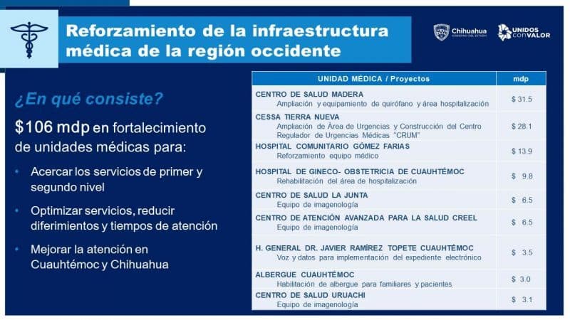El gobernador Javier Corral informó que dentro del Programa de Reconversión Hospitalaria, se invierten 106 millones de pesos para el reforzamiento de la infraestructura médica de la región occidente del estado.
