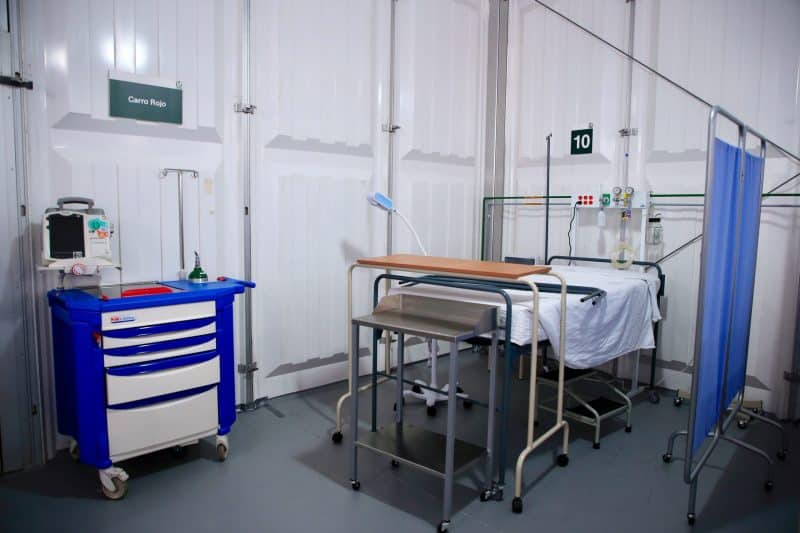 También cuenta con los soportes de rayos X para radiografías de tórax, monitoreo de signos vitales electrocardiográficos, y toma de muestras para estudio de proteína C-reactiva (PCR) para diagnosticar coronavirus.