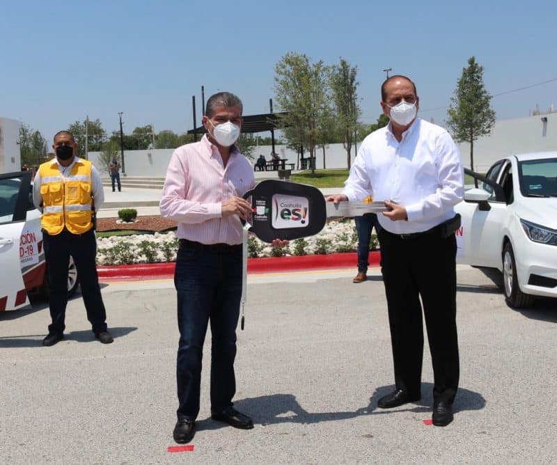 En Piedras Negras, entregó al Municipio 3 vehículos patrulla, con inversión superior a 845 mil pesos, para el Cuerpo de Inspección Covid-19, así como 100 termómetros infrarrojos.