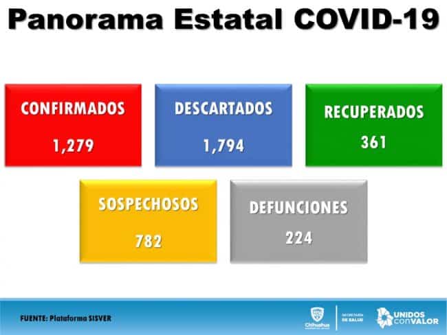 La Secretaría de Salud informó que a este día, en el estado de se tienen 1,279 casos confirmados de COVID-19, 224 personas fallecidas, suman 361 los recuperados, van mil 794 descartados y 782 sospechosos.