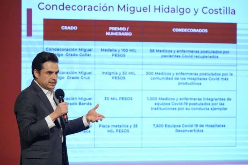 Y la condecoración Miguel Hidalgo en Grado Placa, se hará la entrega de una placa metálica y 25 mil pesos a 7 mil 500 equipos COVID-19 de Hospitales Reconvertidos.