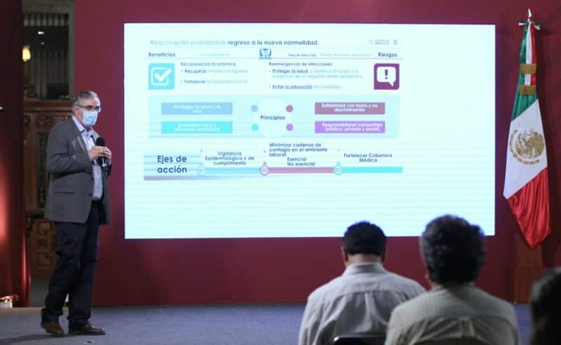 Explicó que el Seguro Social cuenta con tres ejes de acción: vigilancia epidemiológica, a fin de conocer el procedimiento de las empresas en el cumplimiento de las medidas a las que se comprometieron; minimización de las cadenas de contagio en el ambiente laboral; y fortalecimiento de la cobertura médica.