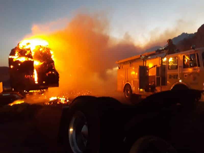TECATE, BC, 18 de junio de 2020.- Personal del Fideicomiso Tramo Carretero Centinela- La Rumorosa y bomberos de Tecate sofocaron el incendio de un tracto camión que trasladaba Alfalfa la mañana del 18 de junio.