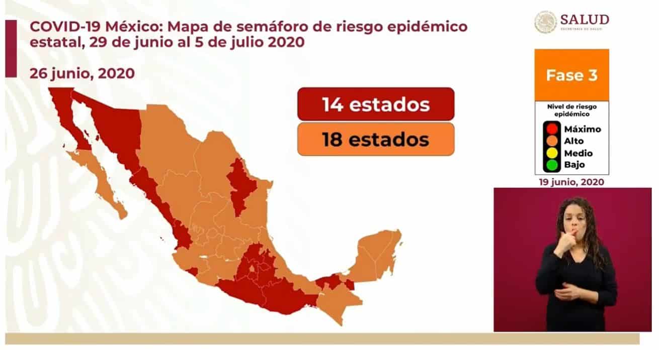 Este viernes 26 de junio se presentó el semáforo de COVID-19 para la semana del 29 de junio al 5 de julio, el cual se encarga de regular las actividades permitidas en cada estado de la república, de acuerdo con el riesgo epidemiológico de contraer el virus SARS-CoV-2 y desarrollar la enfermedad COVID-19.