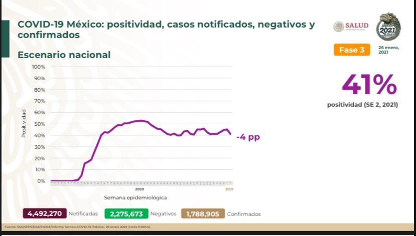 Señaló que hasta este 29 de enero, México acumula un millón 841 mil 893 de casos confirmados de COVID-19; esto es 16 mil 347 registros nuevos en las últimas 24 horas.